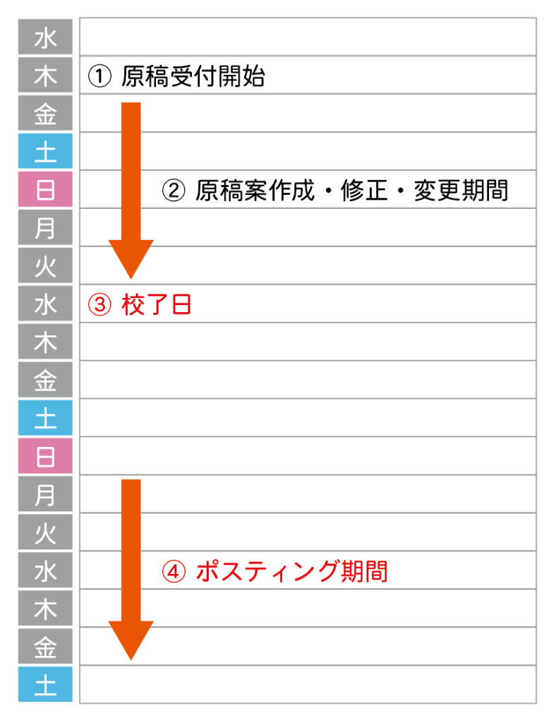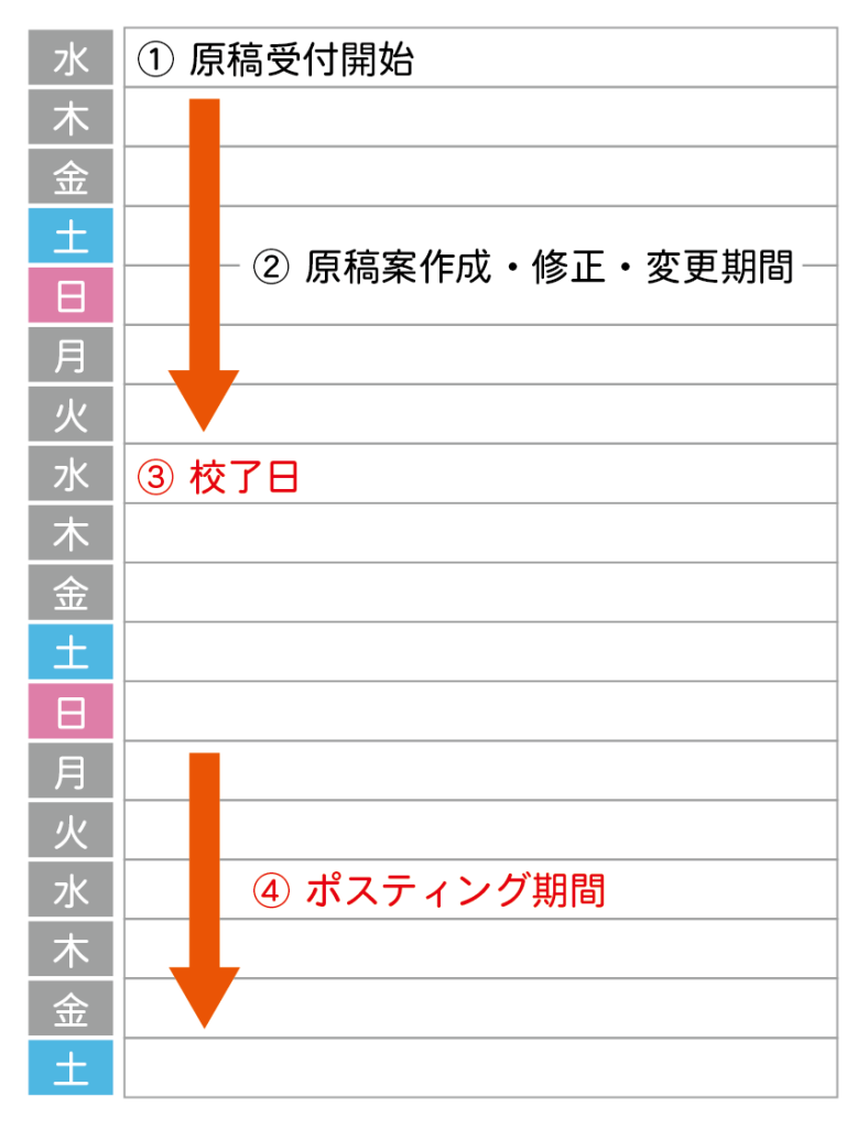 ①ポスティングの前々週の水曜日より原稿の受付を開始いたします(年末年始、祝日等により変更する場合があります。発行カレンダーを参照ください)